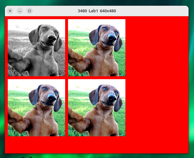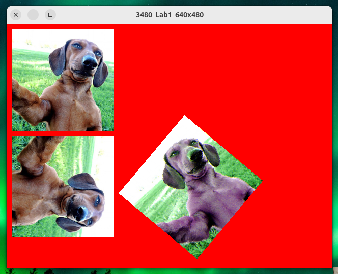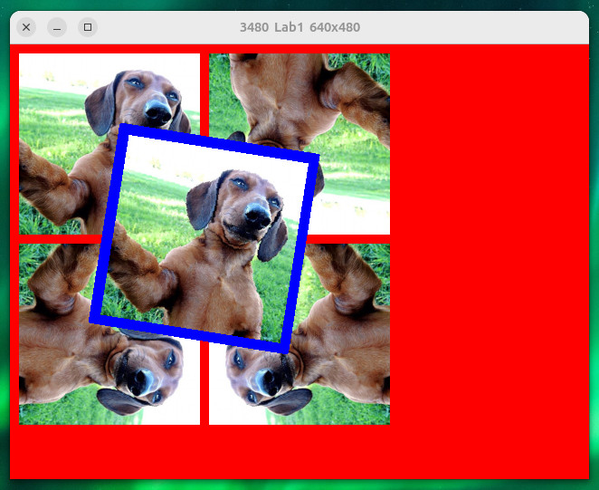 Follow along with your instructor. We will display selfie dog to the screen. Our first goal is to see this...Then put 4 images in place. The same image drawn 4 times.