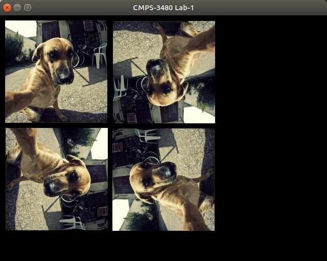 Rotate the images. This is still on key press '1'. The image at lower left will be rotated 90-degrees clockwise. The image at upper right will be rotated 180-degrees. The image at lower right will be rotated 270-degrees clockwise. Selfie dog is rotating around. Gordon will help you get the first rotation done.Source code written in class: #include <iostream> #include <fstream> using namespace std; unsigned char *get_image_stream(const char *fname, int *w, int *h) { ifstream fin(fname); char P, six; fin >> P >> six; cout << "P: " << P << " six: " << six << endl; int width, height, max; fin >> width >> height >> max; cout << width << "x" << height << endl; unsigned char *data = new unsigned char [width * height * 3]; fin.read((char *)data, width*height*3); fin.close(); *w = width; *h = height; return data + 1; } void render() { x11.clear_screen(); if (g.state[1]) { //draw dog image int w, h; unsigned char *data = get_image_stream("lab1.ppm", &w, &h); unsigned char *p = data; for (int i=0; i<h; i++) { for (int j=0; j<w; j++) { x11.set_color_3i(*(p+0), *(p+1), *(p+2)); p += 3; x11.drawPoint(j+10, i+10); } } p = data; for (int i=0; i<h; i++) { for (int j=0; j<w; j++) { x11.set_color_3i(*(p+0), *(p+1), *(p+2)); p += 3; x11.drawPoint(200-i+10, j+220); } } p = data; for (int i=0; i<h; i++) { for (int j=0; j<w; j++) { x11.set_color_3i(*(p+0), *(p+1), *(p+2)); p += 3; x11.drawPoint(j+430, i+10); } } } return; }