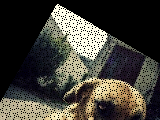 Here is part of the selfie dog rotated 30° The image has artifacts that occur where no pixel is drawn. They are blank spots. This is also a Moire pattern. This happens because we are moving pixels to a new location based on floating-point calculations. The floating-point location of each pixel must be converted to integers. Rounding during the conversion can cause 2 pixels to be drawn in the same location. Your job is to fix this. Look below.Method 1: Instead of moving each pixel to a 'rotated' position, for each pixel, rotate backwards to see where the pixel color should come from. Be sure to check if the location is within the image boundries. If not, draw a black or other color to indicate a background. Method 2: For each pixel drawn, draw the 4 neighboring pixels above, below, at left, and at right, the same color. This is easy and looks pretty good.