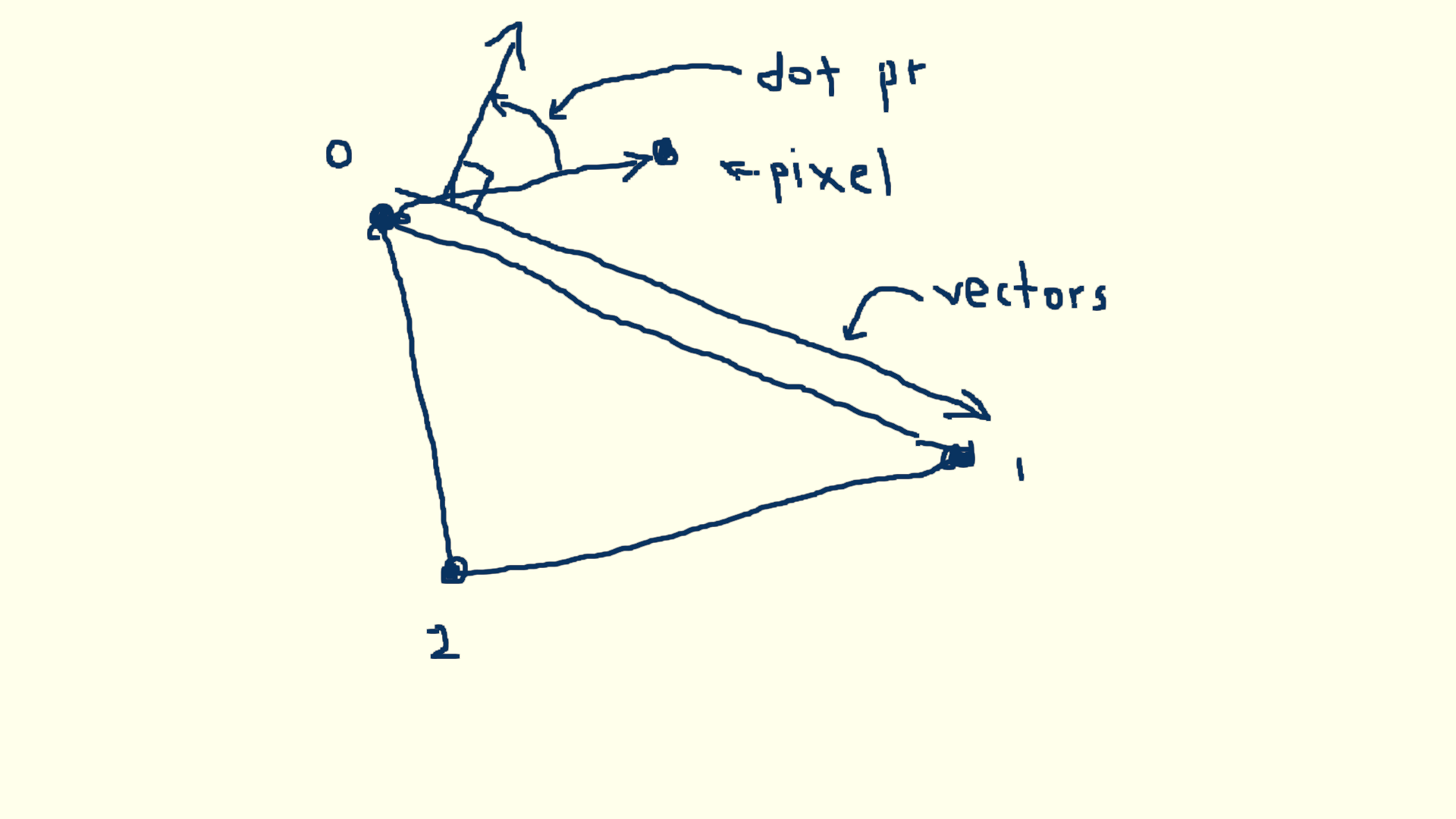 Fill a triangle using barycentric coordinates. Heron's formula for triangle area! You will probably need to write functions such as... Flt getLength(Vec p1, Vec p2); Flt getTriangleArea(Vec p1, Vec p2, Vec p3); bool getBarycentric(Vec tri[3], int x, int y, Flt *u, Flt *v); Use the u, v, w components to derive the color of each pixel in the triangle. Your triangle will be shaded like this...On Monday we will get the blended triangle on the screen together. Insert these three functions into your lab3.cpp program. double getLength(double p1[2], double p2[2]) { double dx = p1[0] - p2[0]; double dy = p1[1] - p2[1]; return sqrt(dx*dx + dy*dy); } double triangleArea(double tri[3][2]) { //get side lengths double a = getLength(tri[0], tri[1]); double b = getLength(tri[1], tri[2]); double c = getLength(tri[2], tri[0]); double s = (a+b+c) / 2.0; return sqrt(s * (s - a) * (s - b) * (s - c)); } bool getBarycentric(double t[3][2], double *pt, double *u, double *v) { //main triangle is already built in t. //build sub-triangle st1 double st1[3][2] = { t[0][0],t[0][1], t[1][0],t[1][1], pt[0],pt[1] }; //build sub-triangle st2 double st2[3][2] = { t[1][0],t[1][1], t[2][0],t[2][1], pt[0],pt[1] }; double areaMain = triangleArea(t); double areaSub1 = triangleArea(st1); double areaSub2 = triangleArea(st2); *u = areaSub1 / areaMain; *v = areaSub2 / areaMain; return ((*u + *v) <= 1.0 && *u >= 0.0 && *v >= 0.0); } Place them just above the physics() function. Get your mode 9 in-place in your code. To start this yourself... 1. define in global: double tri[3][2]; 2. in check_keys for key 9, generate 3 random points in your g.tri array. 3. in render: check for mode 9 put x,y in double pt[2] array call getBarycentric function if it returns true, double w = 1.0-u-v scale u,v,w by 255.0 use scaled u,v,w as the colors for the pixel you are done We will do the steps above together in class. Extra credit if you get this working on your own, over the weekend.