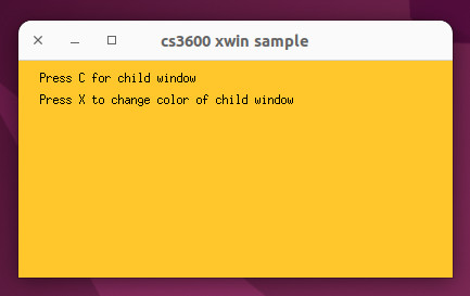 3600 - Operating Systems - Lab-3 extra creditFinish your mylab3.c program first, then you can work on this. 1. Copy your 3600/2/xwin89.c program to 3600/3/myextra3.c 2. Add some text similar to that above. XDrawString() 3. Use signals to communicate between parent and child windows. SIGUSR1 maybe. 4. The parent window will change the color of the child window. On key press or mouse click. 5. You may ask Monique for help. 6. Clues: You can call render() from a signal handler. You can store the window background color in a global variable. Will be collected at 9:50am --------------------------- 3600/3/myextra3.c