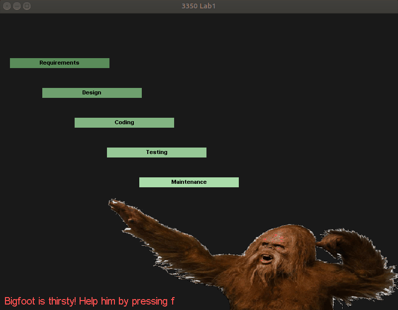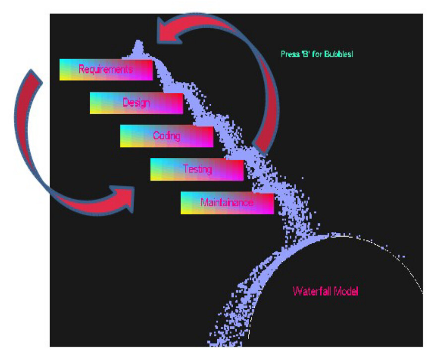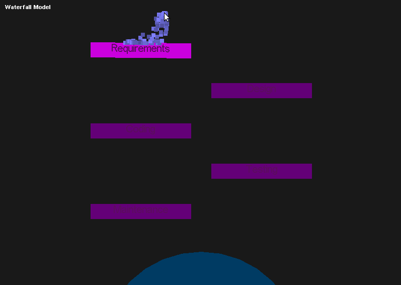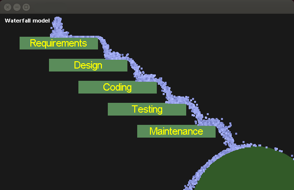 Continue working on your waterlab6.cpp 1. Draw 5 boxes 2. Align them like the Waterfall Model that we have learned. 3. Make your mouse drop many particles to look like a stream of water. 4. The particles will flow down your Waterfall. Hints: Make an array of 5 box classes. Set the top box into position, and the rest are offsets from that. For each particle, check for collision with all of the boxes. Your goal will be something like this...![]()