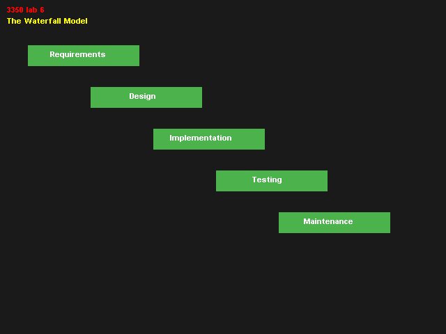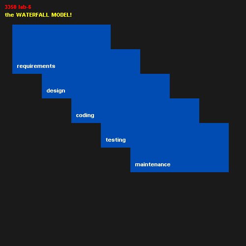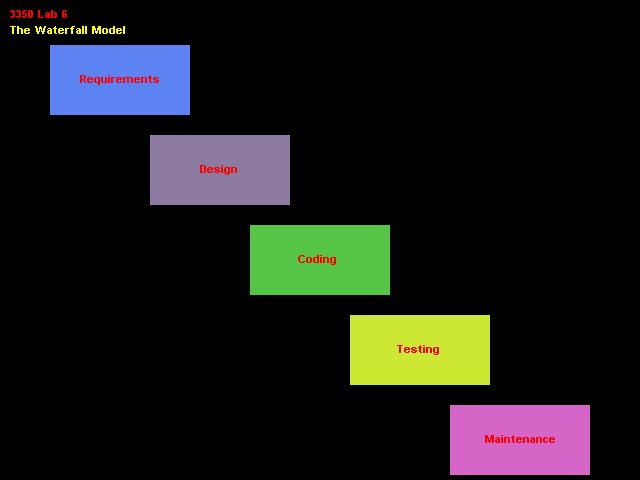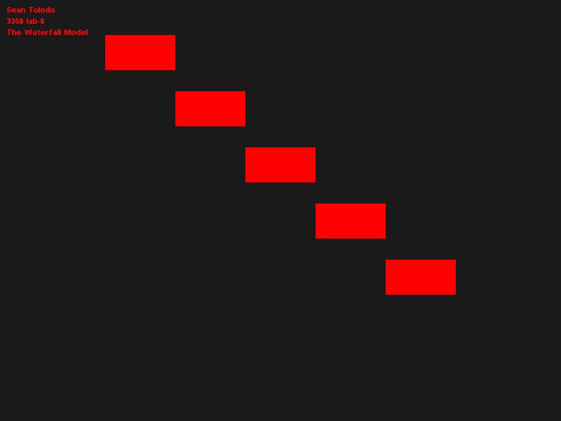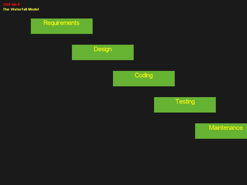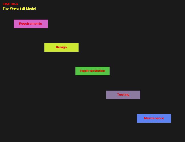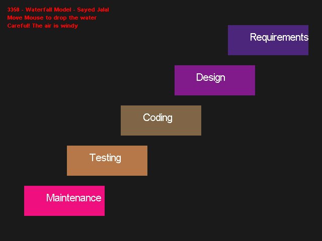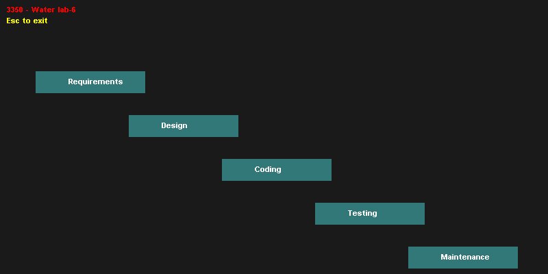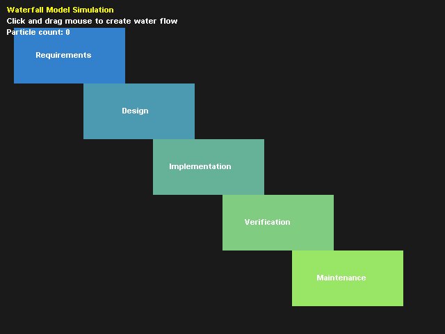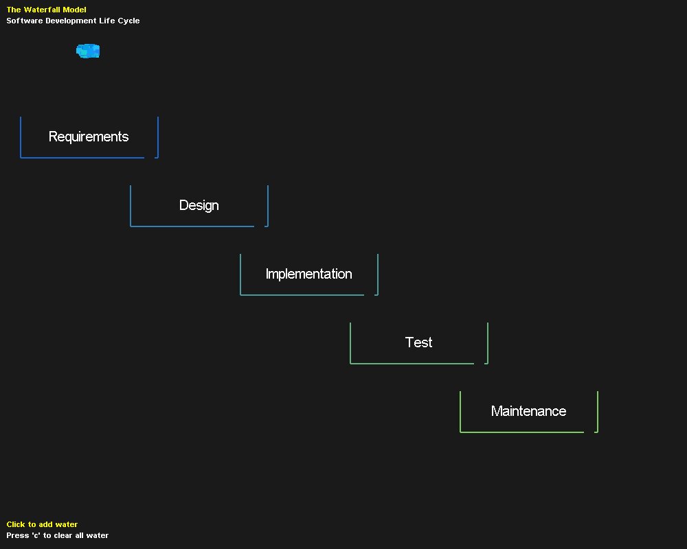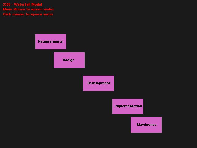 Waterfall model screen shots This was lab-6 (homework) updated: Apr 28 Images were produced by running your program, then using Imagemagick import. 1 program had water flowing when they started. Some programs are incomplete or have syntax/compile errors. Some programs look very nice.