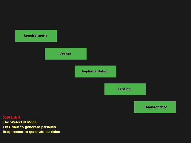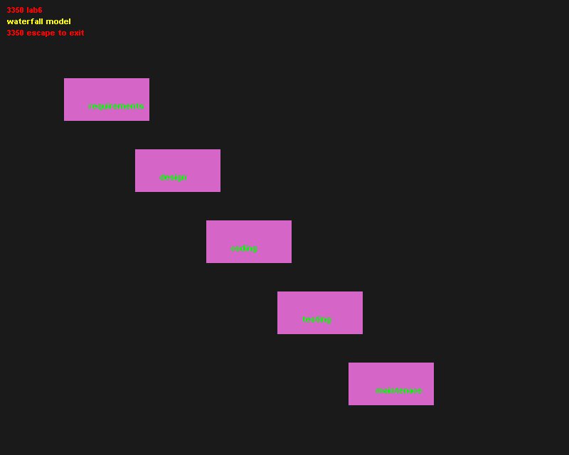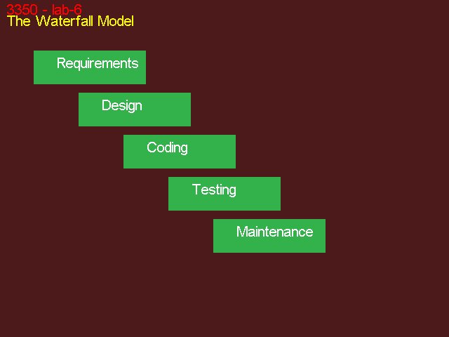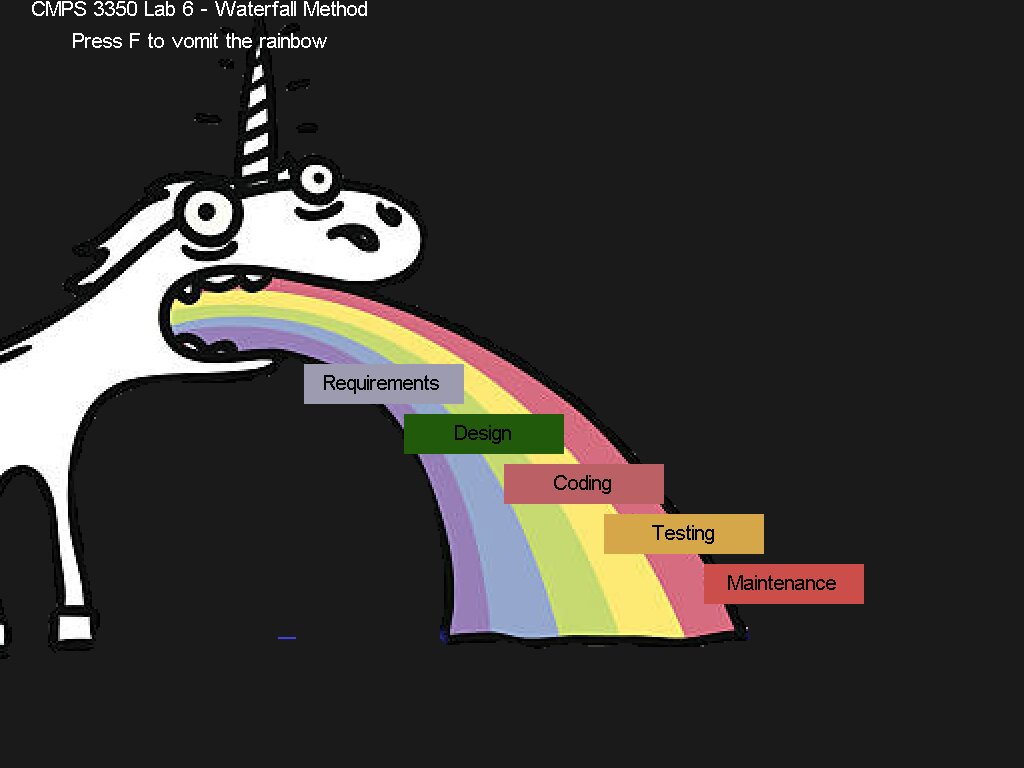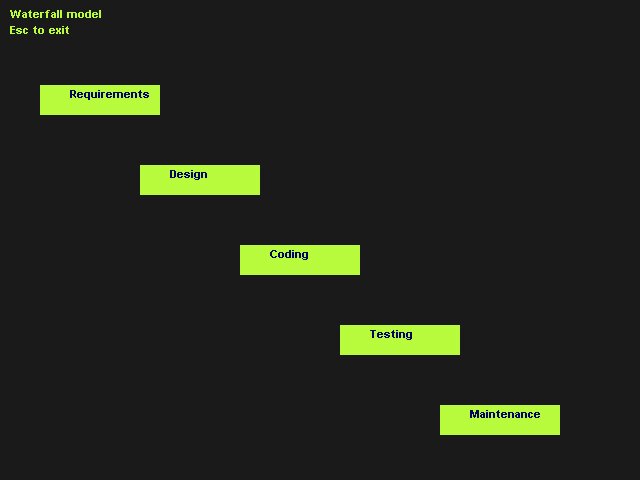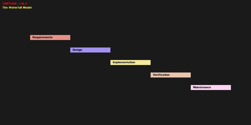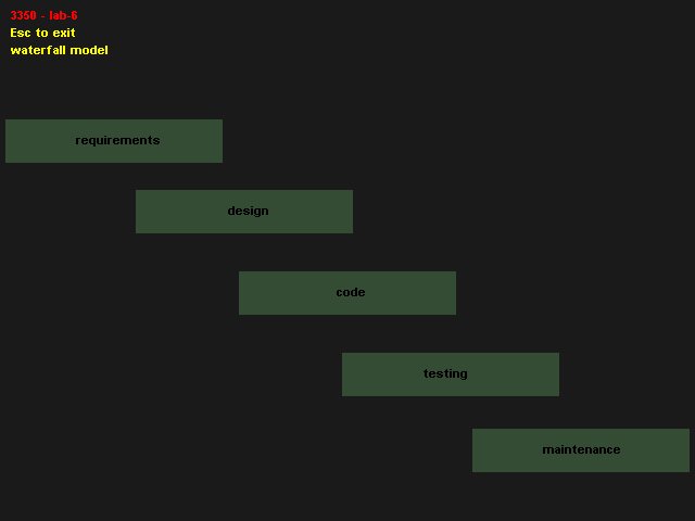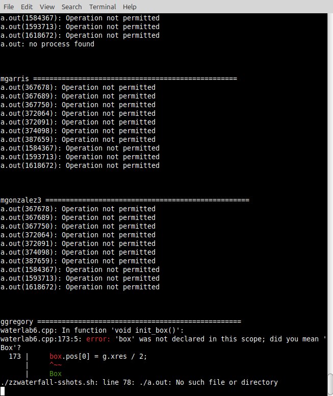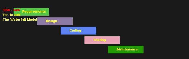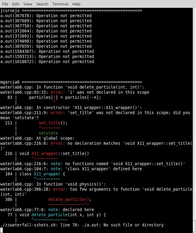 Waterfall model screen shots This was lab-6 (homework) updated: Apr 28 Images were produced by running your program, then using Imagemagick import. 1 program had water flowing when they started. Some programs are incomplete or have syntax/compile errors. Some programs look very nice.